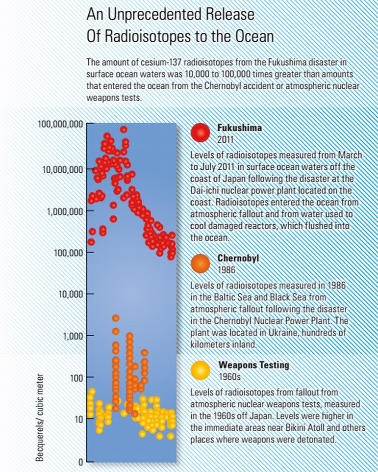 This graphic from Woods Hole in Massachusetts – one of the world’s top ocean science institutions – shows how much more cesium was dumped into the sea off Japan from Fukushima as compared to nuclear testing and Chernobyl: